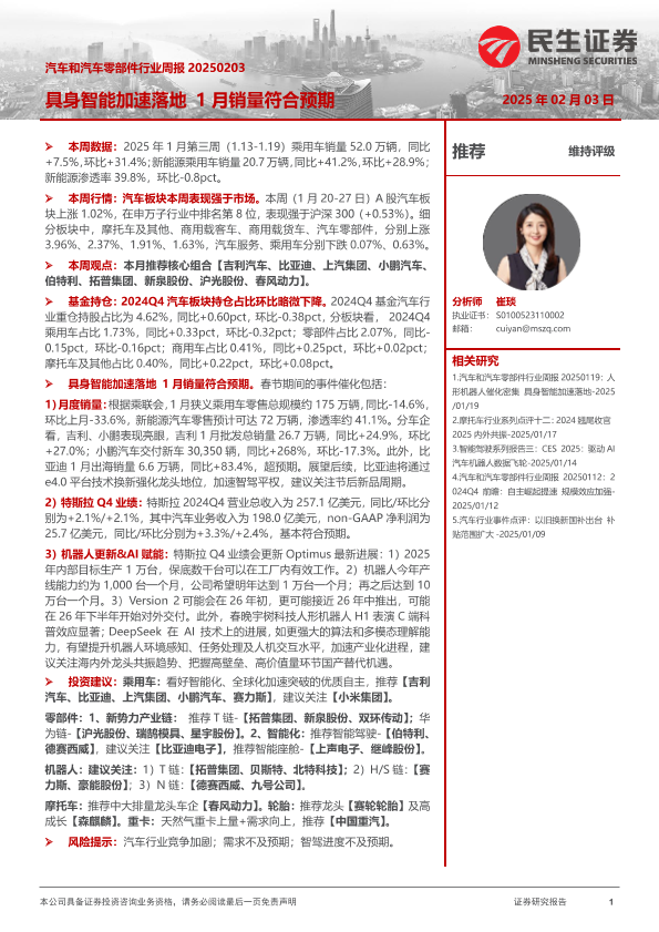 【民生证券】【20250203】汽车和汽车零部件行业周报:具身智能加速落地 1月销量符合预期-42页