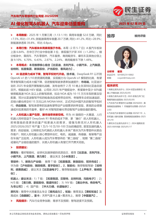 【民生证券】【20250209】汽车和汽车零部件行业周报:AI催化智驾&机器人 汽车迎来估值重构-34页