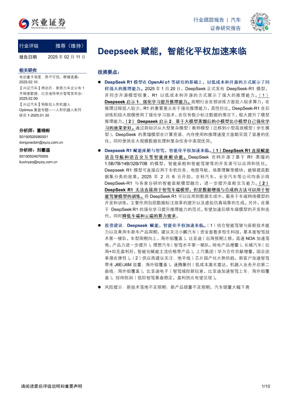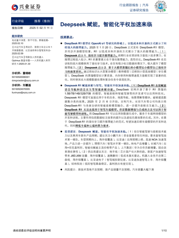 【兴业证券】【20250211】20250211-兴业证券-汽车行业跟踪报告:Deepseek赋能,智能化平权加速来临-10页