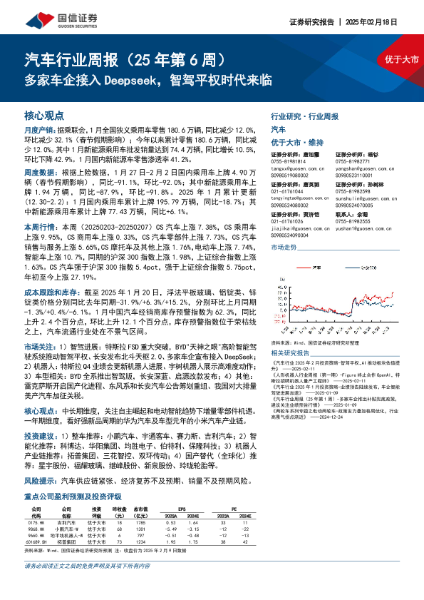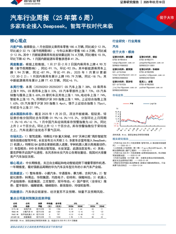 【国信证券】【20250218】汽车行业周报(25年第6周):多家车企接入Deepseek,智驾平权时代来临-31页