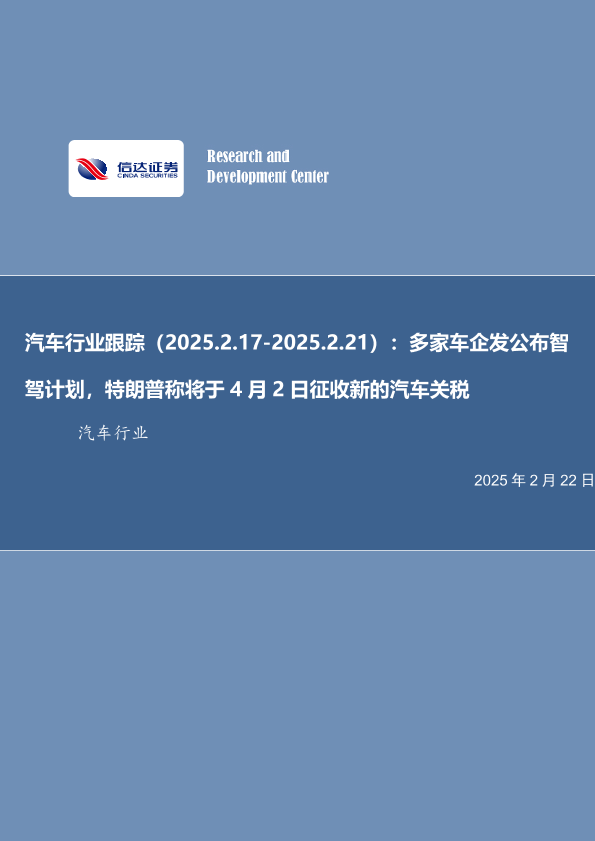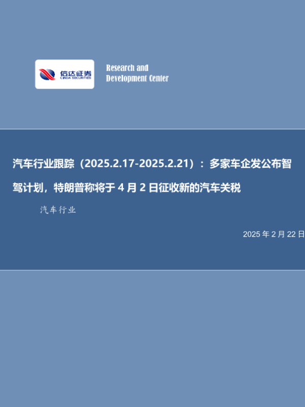 【信达证券】【20250222】汽车行业跟踪:多家车企发公布智驾计划,特朗普称将于4月2日征收新的汽车关税-14页