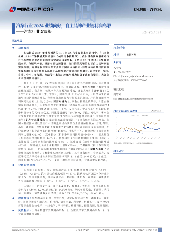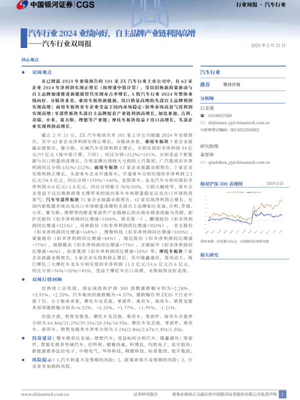 【银河证券】【20250221】汽车行业双周报:汽车行业2024业绩向好,自主品牌产业链利润高增-22页