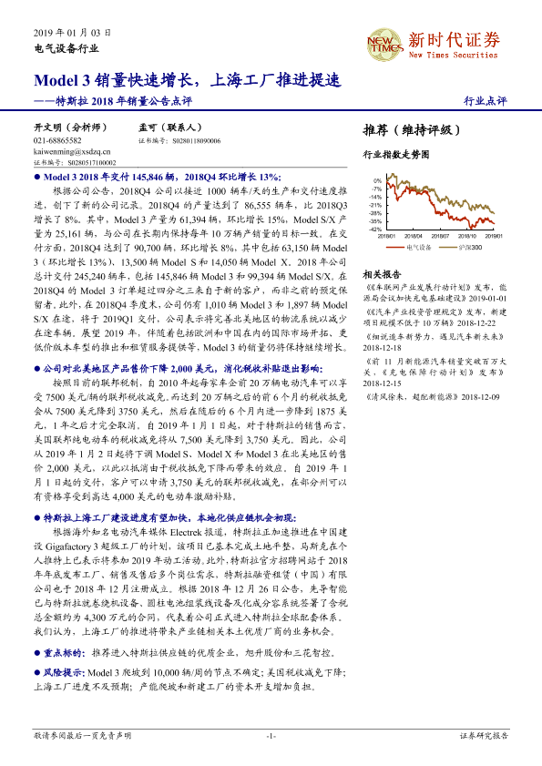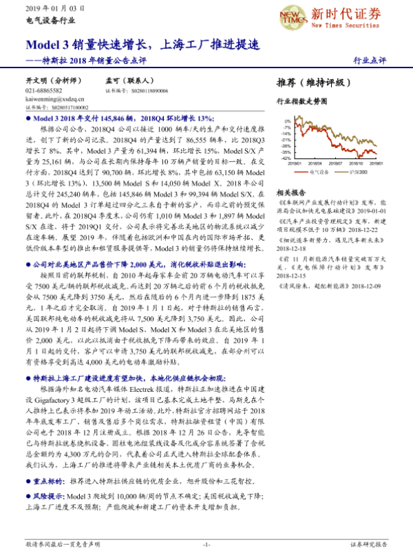 【新时代证券】【20190103】特斯拉2018年销量公告点评:Model3销量快速增长,上海工厂推进提速-3页