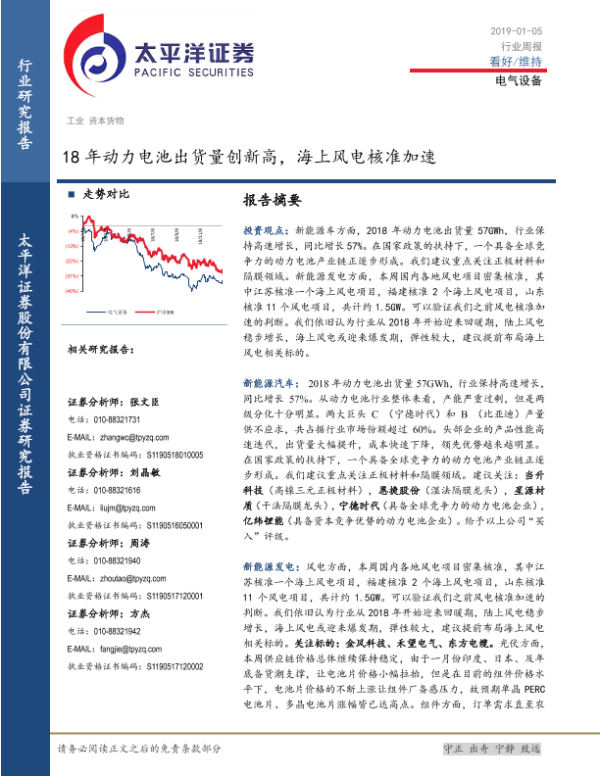 【太平洋证券】【20190105】20190105-太平洋-电气设备行业周报:18年动力电池出货量创新高,海上风电核准加速-19页