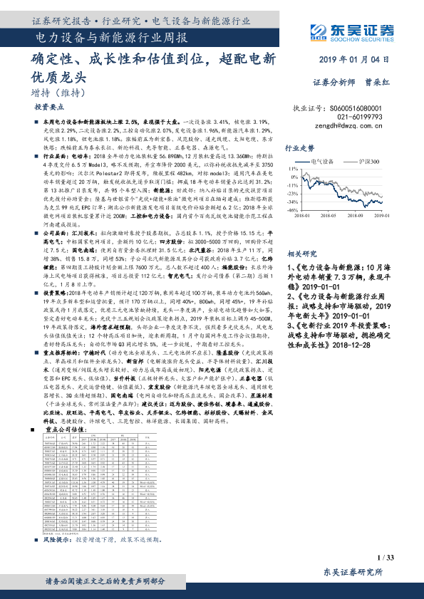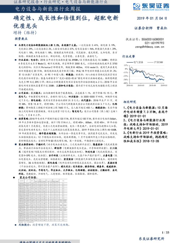 【东吴证券】【20190104】电力设备与新能源行业周报:确定性、成长性和估值到位,超配电新优质龙头-33页