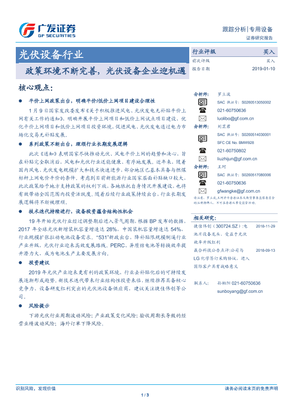 【广发证券】【20190110】光伏设备行业:政策环境不断完善,光伏设备企业迎机遇-3页