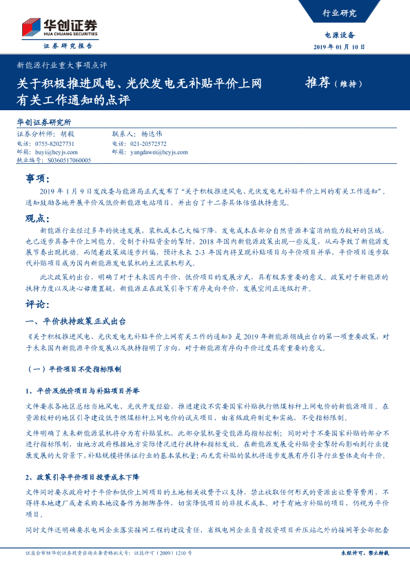 【华创证券】【20190110】关于积极推进风电、光伏发电无补贴平价上网有关工作通知的点评-6页