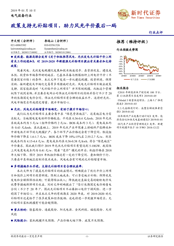 【新时代证券】【20190110】电气设备行业点评:政策支持无补贴项目,助力风光平价最后一码-3页