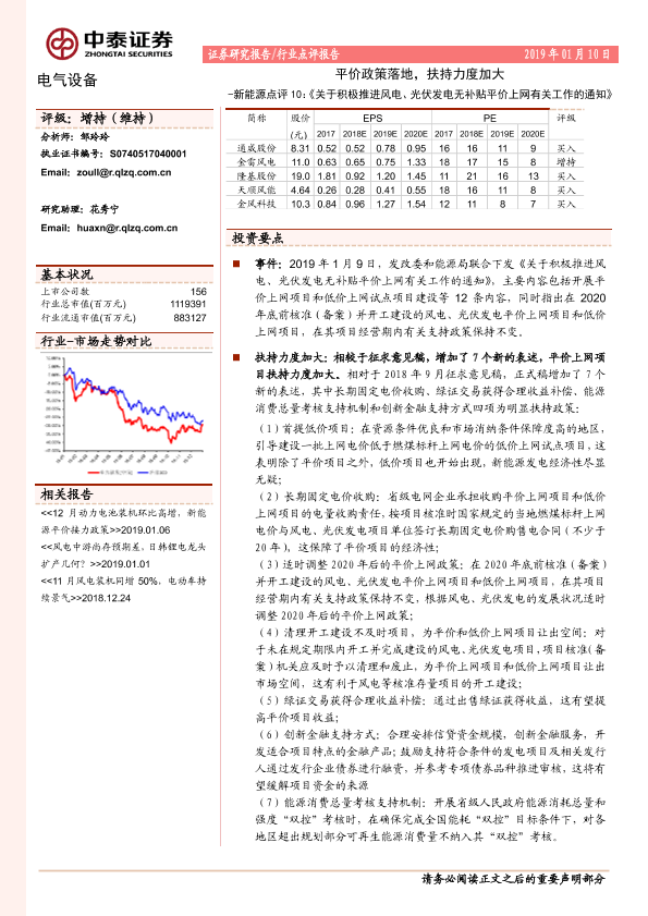 【中泰证券】【20190110】20190110-中泰证券-新能源点评10:《关于积极推进风电、光伏发电无补贴平价上网有关工作的通知》:平价政策落地,扶持力度加大-7页