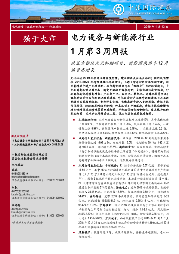 【中银证券】【20190113】电力设备与新能源行业1月第3周周报:政策力推风光无补贴项目,新能源乘用车12月销量高增长-15页