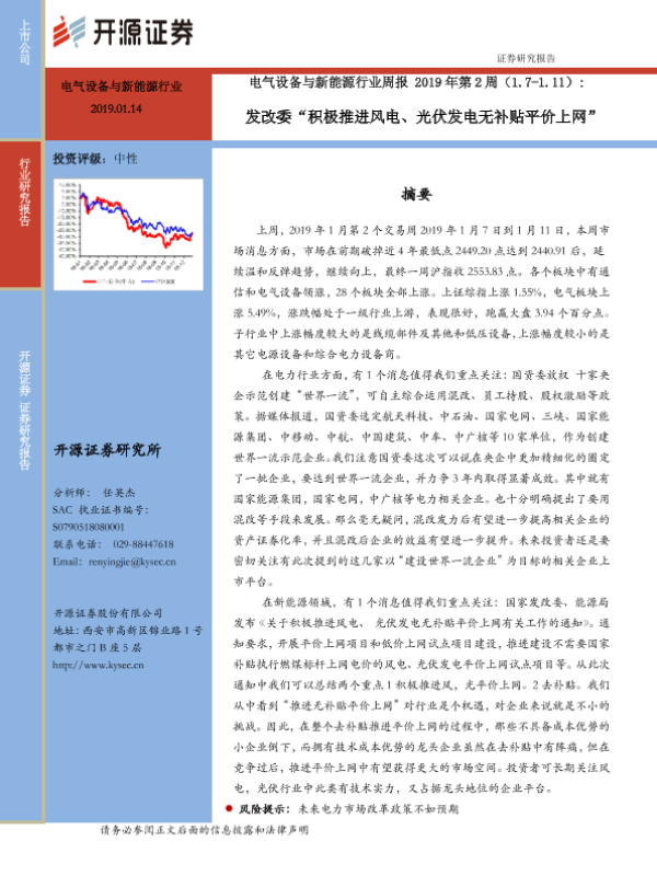 【开源证券】【20190114】电气设备与新能源行业周报2019年第2周:发改委“积极推进风电、光伏发电无补贴平价上网”-12页