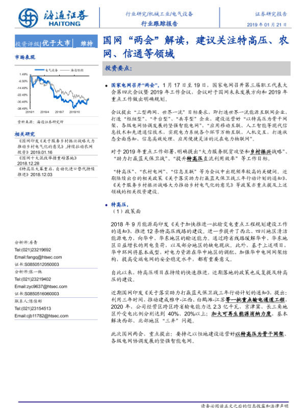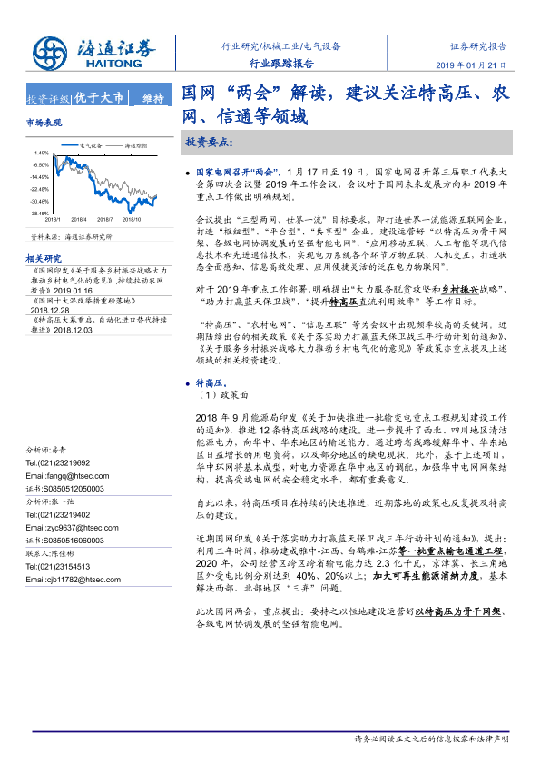 【海通证券】【20190121】电气设备行业跟踪报告:国网“两会”解读,建议关注特高压、农网、信通等领域-4页