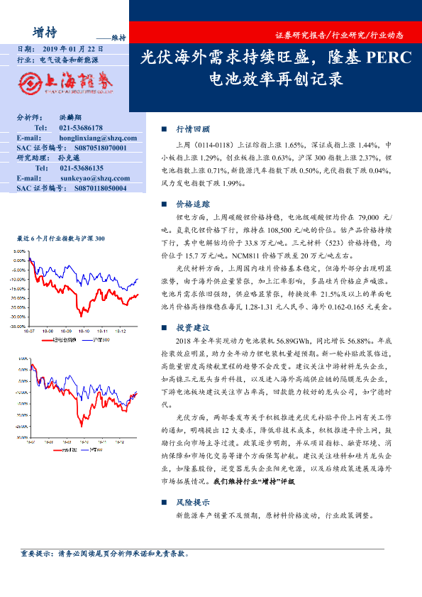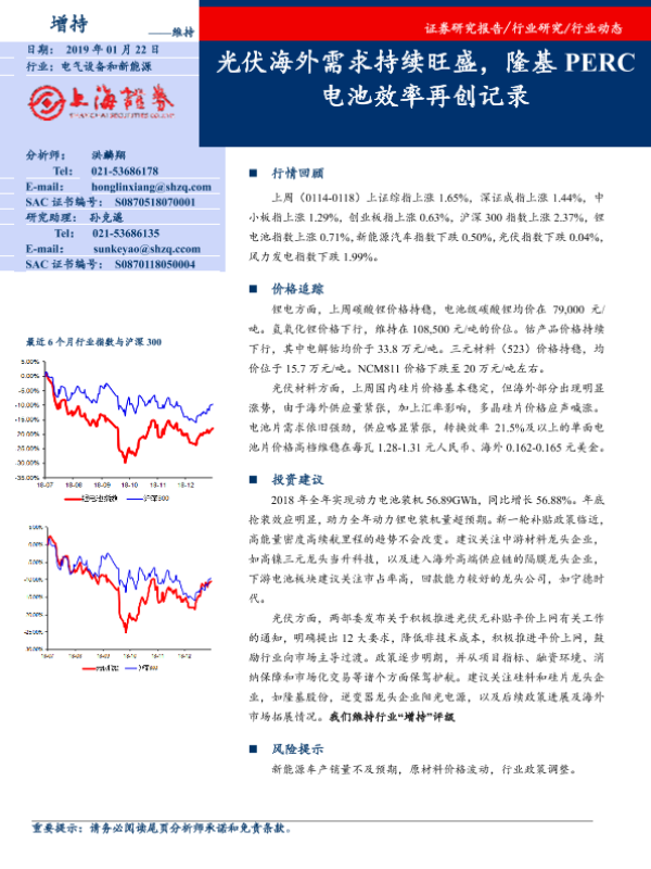 【上海证券】【20190122】电气设备和新能源行业周报:光伏海外需求持续旺盛,隆基PERC电池效率再创记录-15页