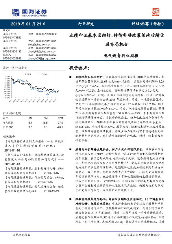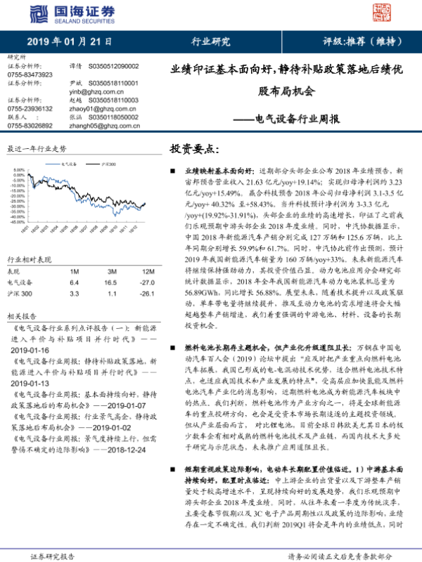 【国海证券】【20190121】电气设备行业周报:业绩印证基本面向好,静待补贴政策落地后绩优股布局机会-30页