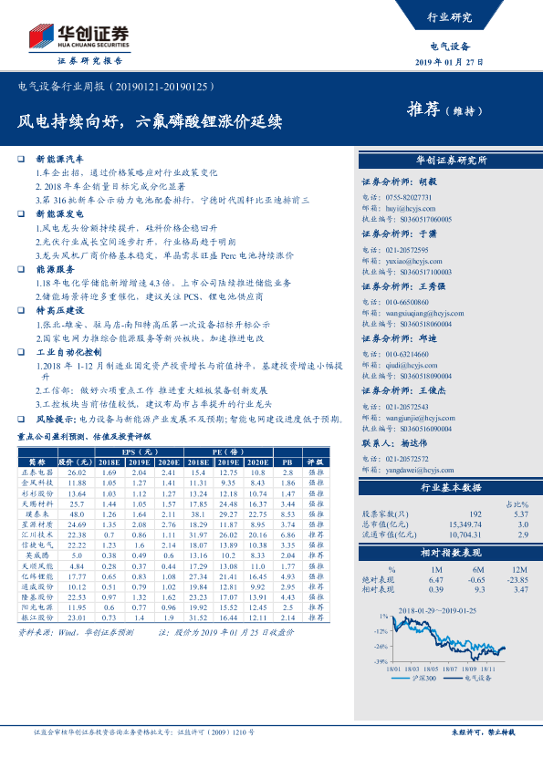 【华创证券】【20190127】电气设备行业周报:风电持续向好,六氟磷酸锂涨价延续-22页