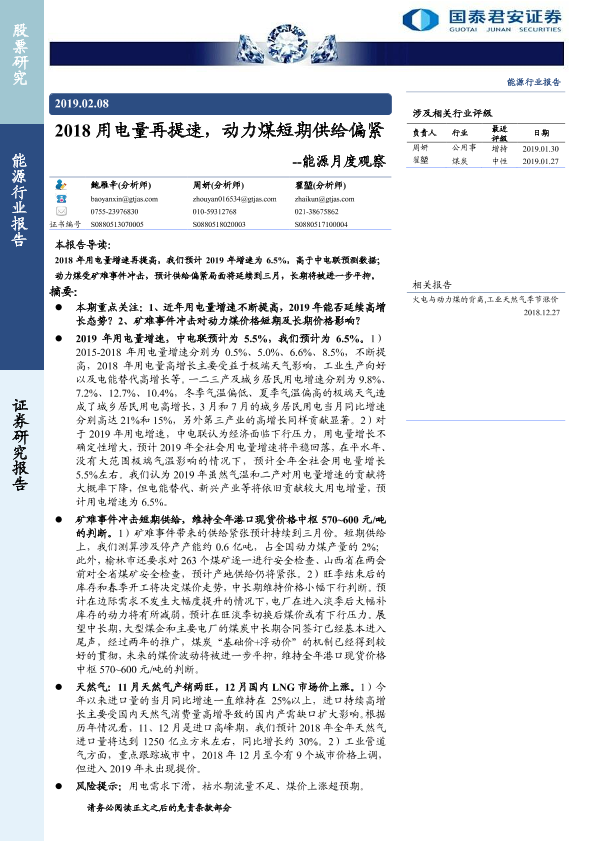 【国泰君安证券】【20190208】20190208-国泰君安-能源月度观察:2018用电量再提速,动力煤短期供给偏紧-22页