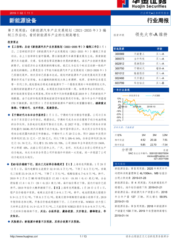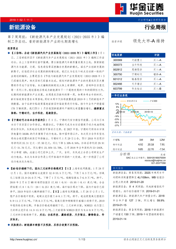 【华金证券】【20190211】新能源设备第7周周报:《新能源汽车产业发展规划(2021-2035年)》编制工作启动,看好新能源车产业的长期高增长-13页