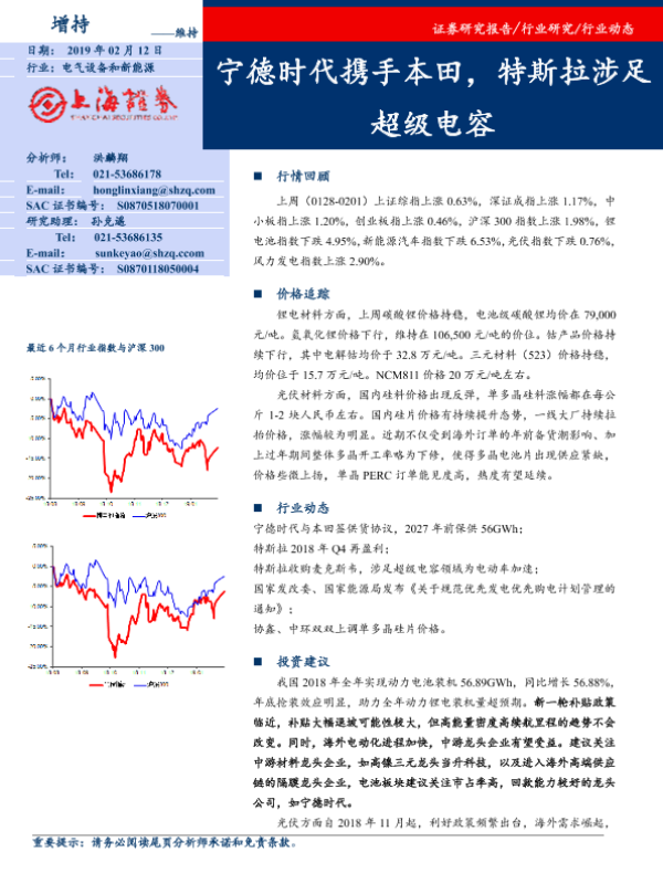 【上海证券】【20190212】20190212-上海证券-电气设备和新能源行业动态:宁德时代携手本田,特斯拉涉足超级电容-16页