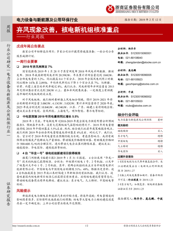 【浙商证券】【20190212】电力设备与新能源及公用环保行业周报:弃风现象改善,核电新机组核准重启-2页