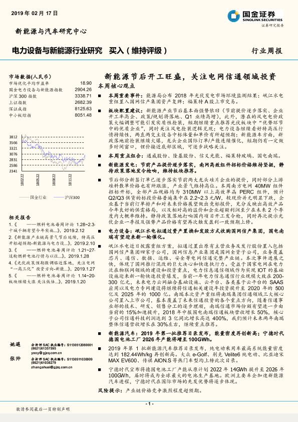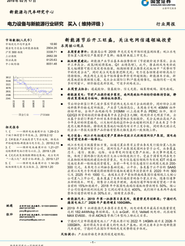 【国金证券】【20190217】20190217-国金证券-新能源与电力设备行业研究周报:新能源节后开工旺盛,关注电网信通领域投资-4页