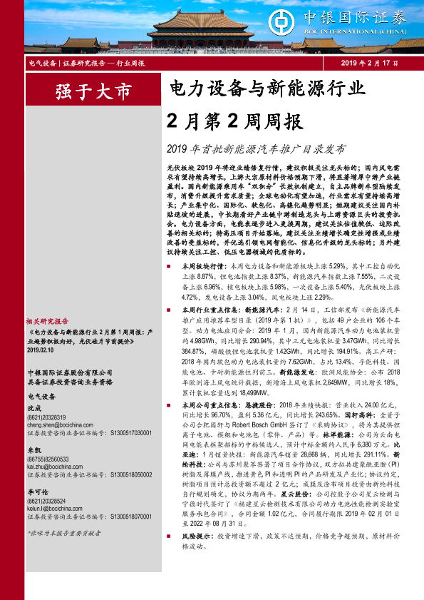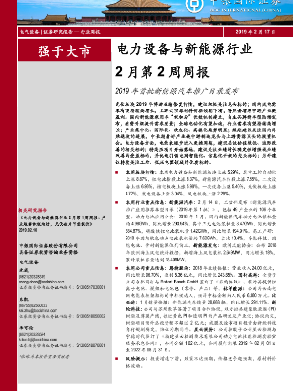 【中银证券】【20190217】电力设备与新能源行业2月第2周周报:2019年首批新能源汽车推广目录发布-16页