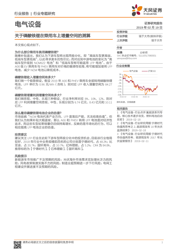 【天风证券】【20190219】关于磷酸铁锂在乘用车上增量空间的测算-6页