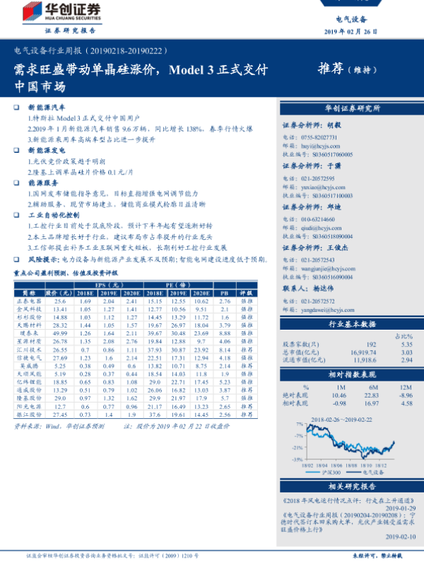 【华创证券】【20190226】电气设备行业周报:需求旺盛带动单晶硅涨价,Model 3正式交付中国市场-23页