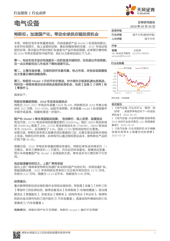 【天风证券】【20190303】电气设备行业报告:特斯拉:加速国产化,带动全球供应链投资机会-7页