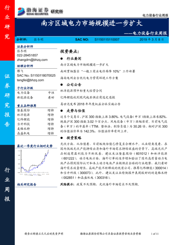 【渤海证券】【20190308】电力设备行业周报:南方区域电力市场规模进一步扩大-11页
