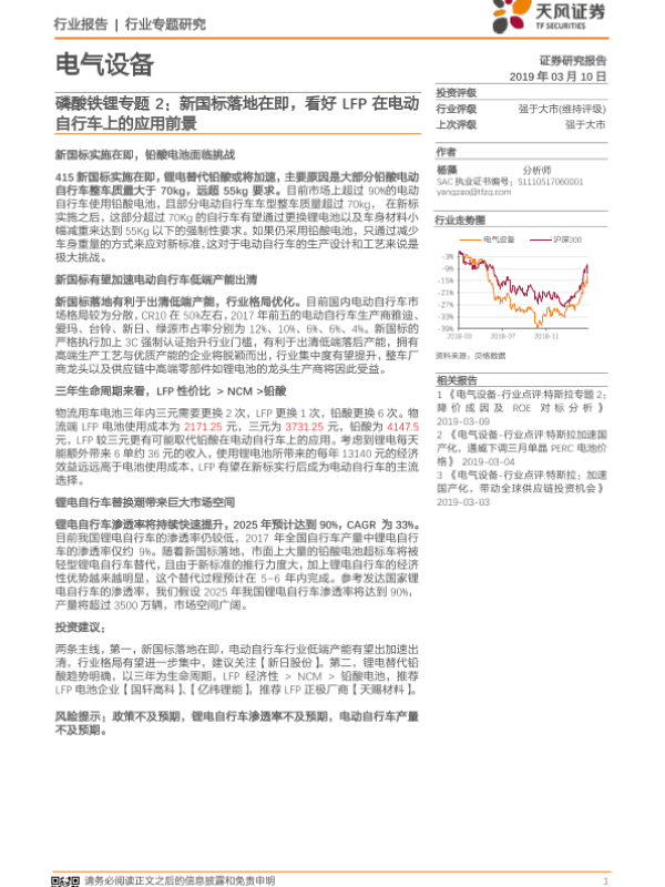 【天风证券】【20190310】电气设备行业专题研究:磷酸铁锂专题2:新国标落地在即,看好LFP在电动自行车上的应用前景-8页