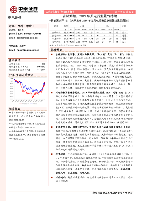 【中泰证券】【20190312】《关于发布2019年度风电投资监测预警结果的通知》:吉林解禁,2019年风电行业景气持续-15页