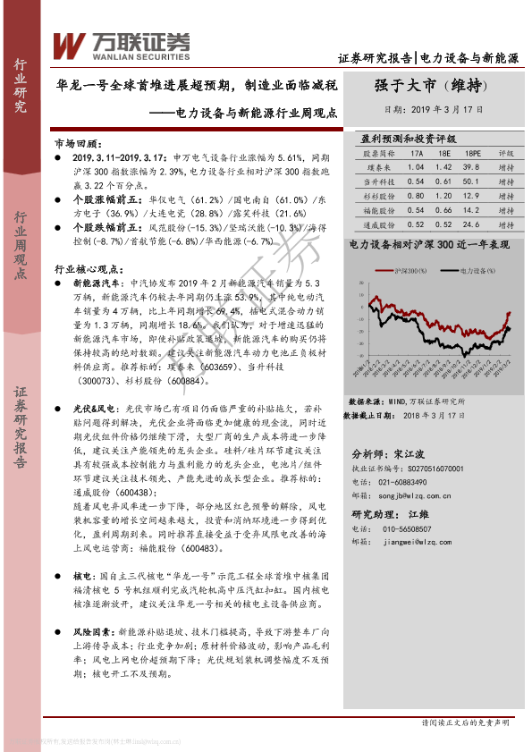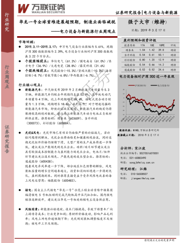 【万联证券】【20190317】电力设备与新能源行业周观点:华龙一号全球首堆进展超预期,制造业面临减税-12页