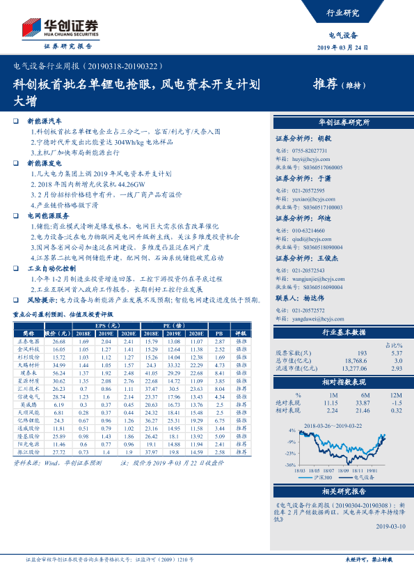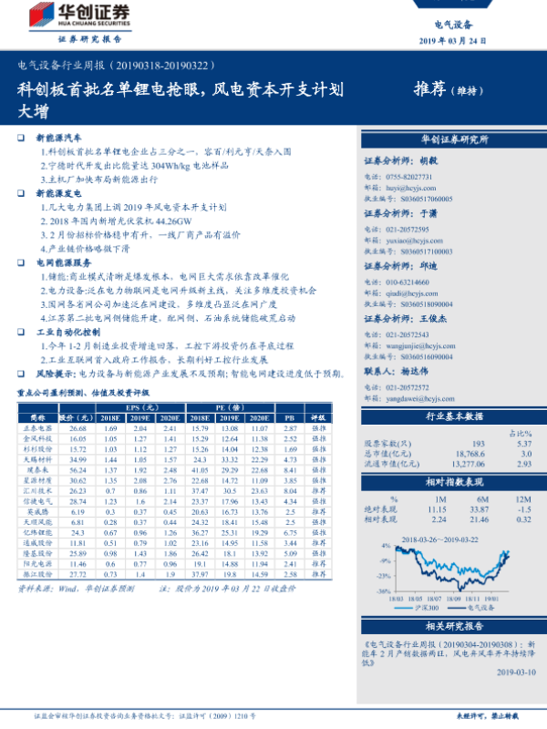 【华创证券】【20190324】电气设备行业周报:科创板首批名单锂电抢眼,风电资本开支计划大增-21页