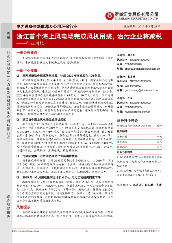 【浙商证券】【20190325】电力设备与新能源及公用环保行业周报:浙江首个海上风电场完成风机吊装,治污企业将减税-2页