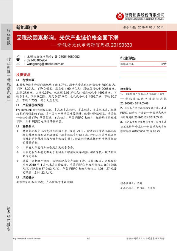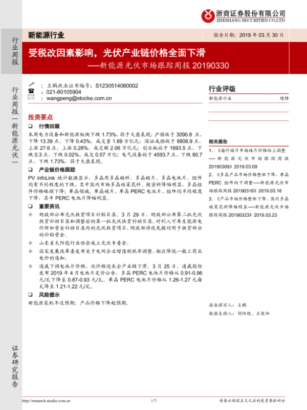 【浙商证券】【20190330】20190330-浙商证券-新能源光伏市场跟踪周报:受税改因素影响,光伏产业链价格全面下滑-7页