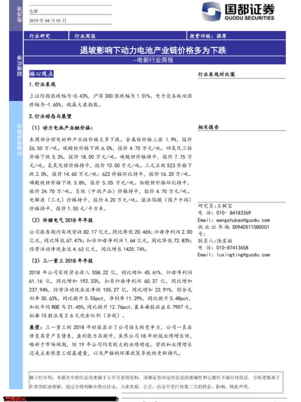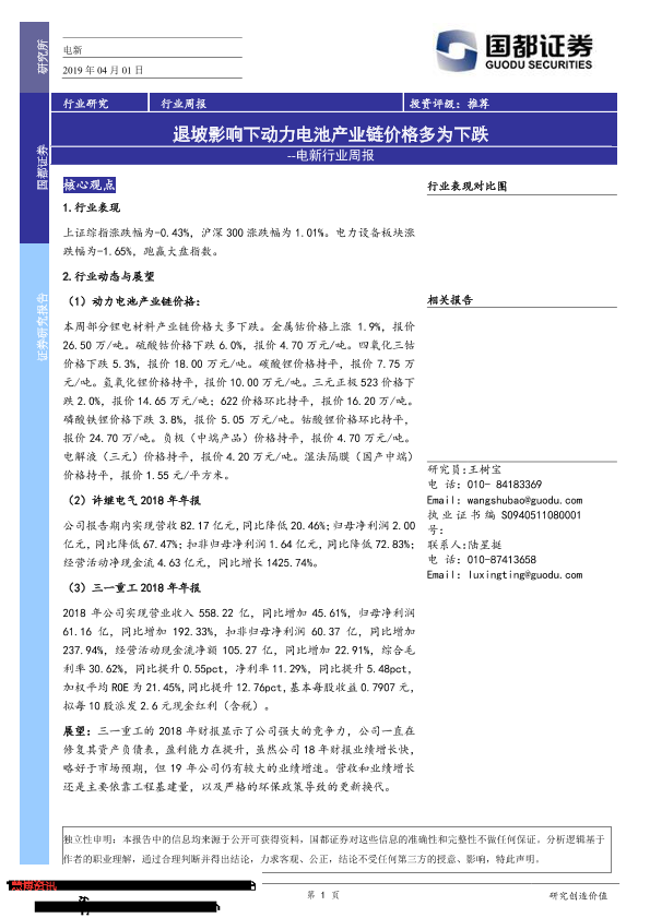 【国都证券】【20190401】电新行业周报:退坡影响下动力电池产业链价格多为下跌-4页