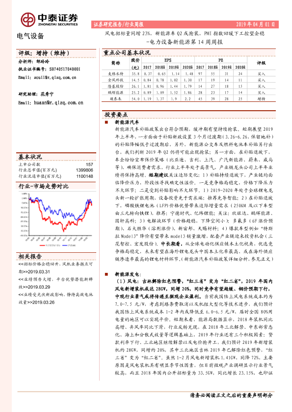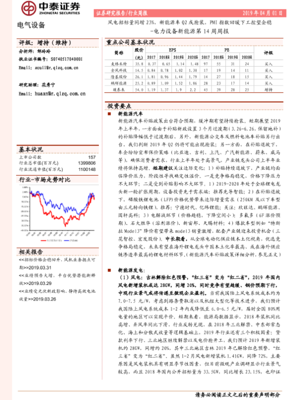 【中泰证券】【20190401】电力设备新能源行业第14周周报:风电招标量同增23%,新能源车Q2或抢装,PMI指数回暖下工控望企稳-30页