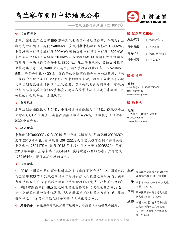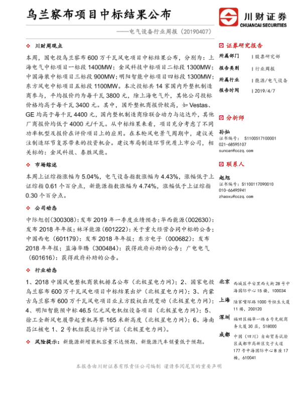 【川财证券】【20190407】电气设备行业周报:乌兰察布项目中标结果公布-10页