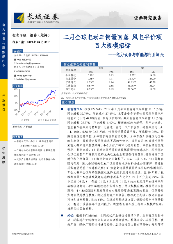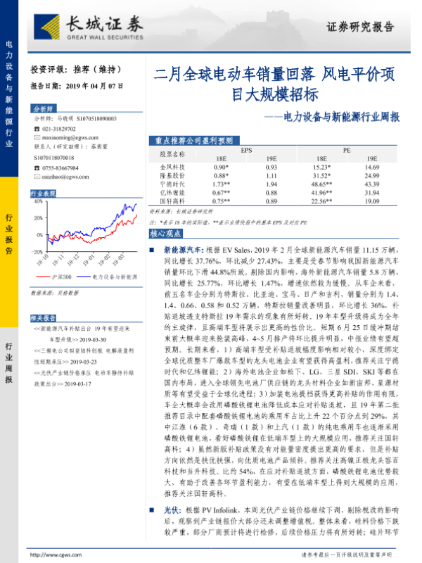 【长城证券】【20190407】电力设备与新能源行业周报:二月全球电动车销量回落 风电平价项目大规模招标-16页