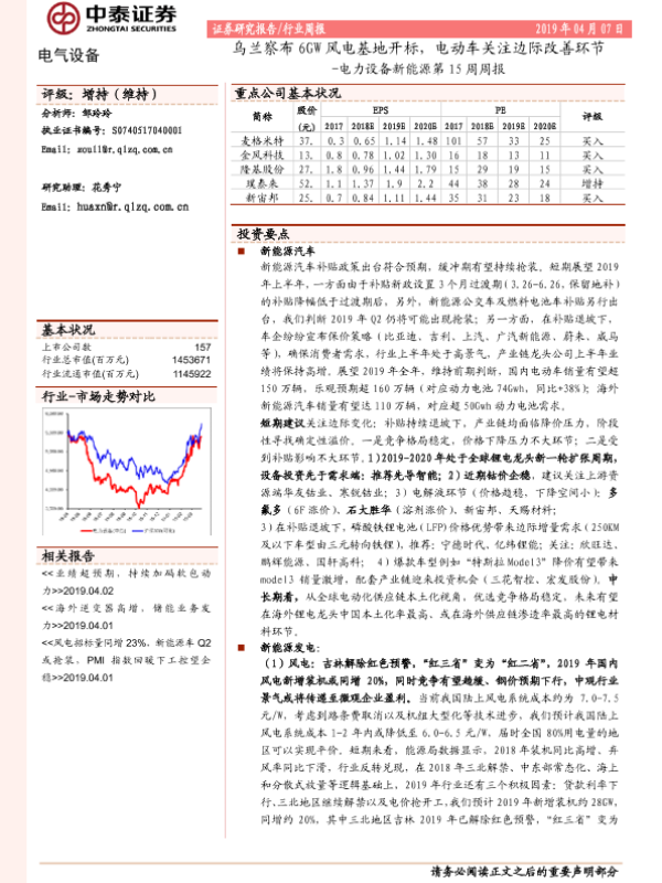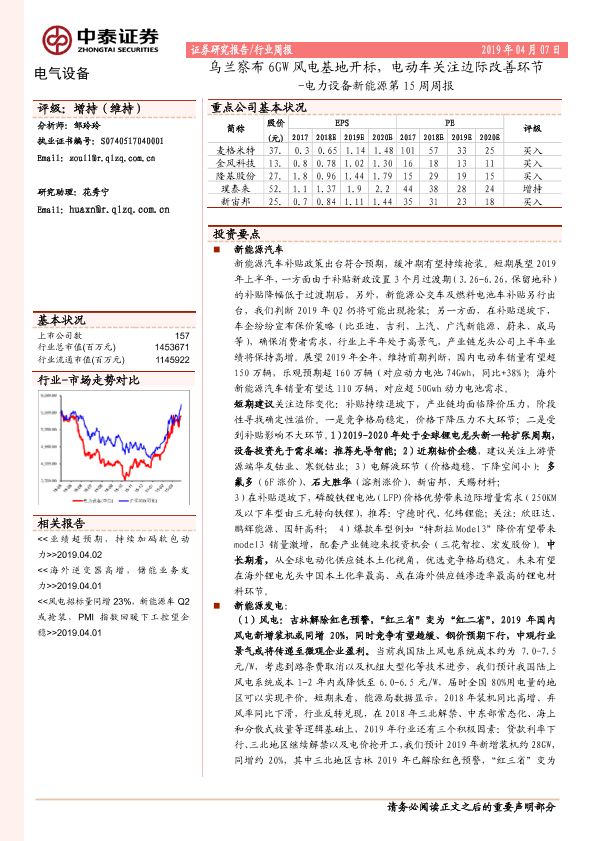【中泰证券】【20190407】电力设备新能源第15周周报:乌兰察布6GW风电基地开标,电动车关注边际改善环节-26页