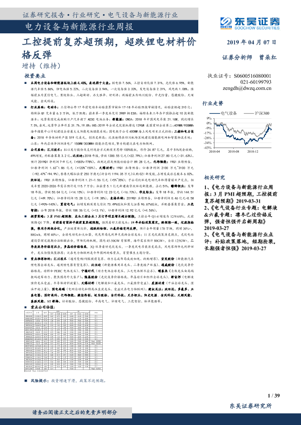 【东吴证券】【20190407】电力设备与新能源行业周报:工控提前复苏超预期,超跌锂电材料价格反弹-39页