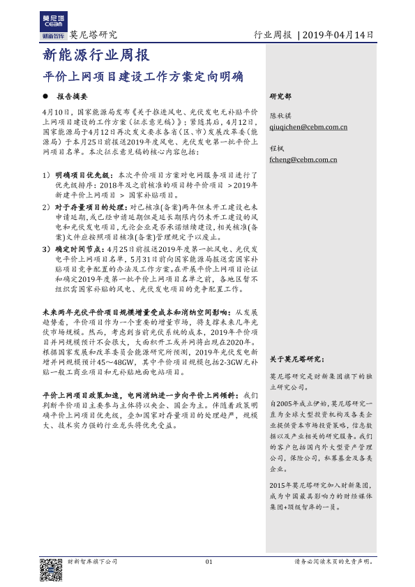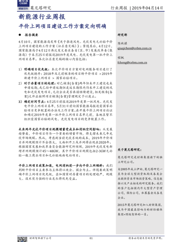 【莫尼塔研究】【20190414】20190414-莫尼塔投资-新能源行业周报:平价上网项目建设工作方案定向明确-9页