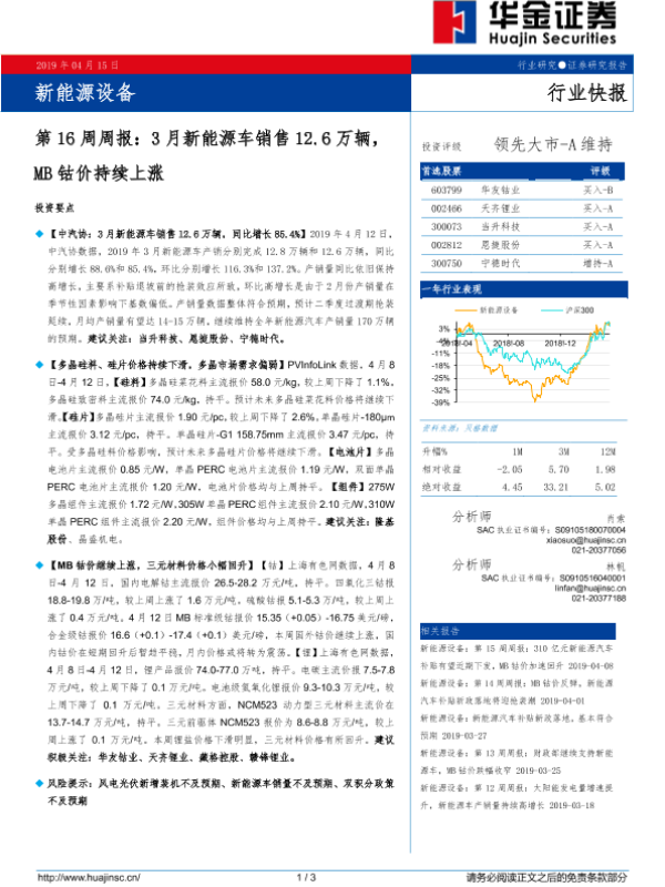 【华金证券】【20190415】20190415-华金证券-新能源设备第16周周报:3月新能源车销售12.6万辆,MB钴价持续上涨-3页
