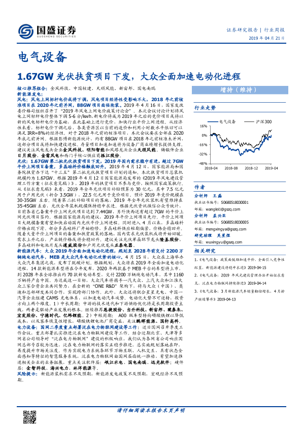 【国盛证券】【20190421】电气设备行业周报:1.67GW光伏扶贫项目下发,大众全面加速电动化进程-23页