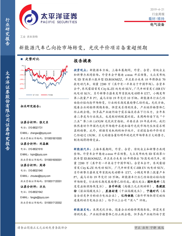 【太平洋证券】【20190421】20190421-太平洋-电气设备行业周报:新能源汽车已向抢市场转变,光伏平价项目备案超预期-19页