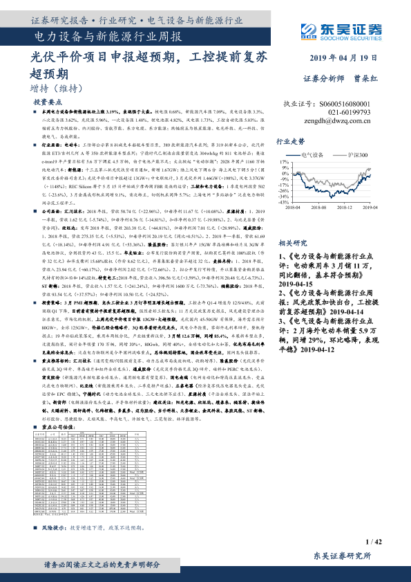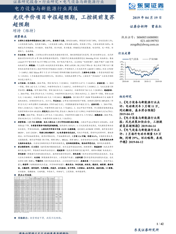 【东吴证券】【20190419】电力设备与新能源行业周报:光伏平价项目申报超预期,工控提前复苏超预期-42页