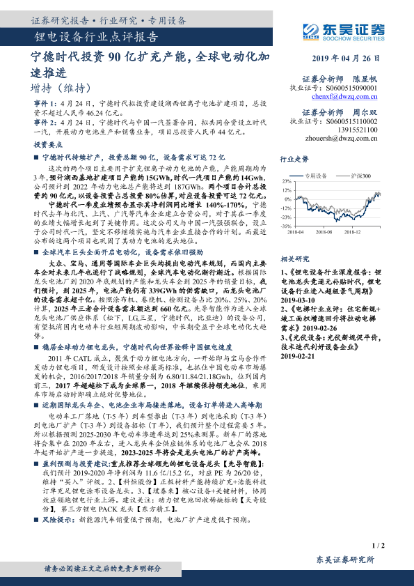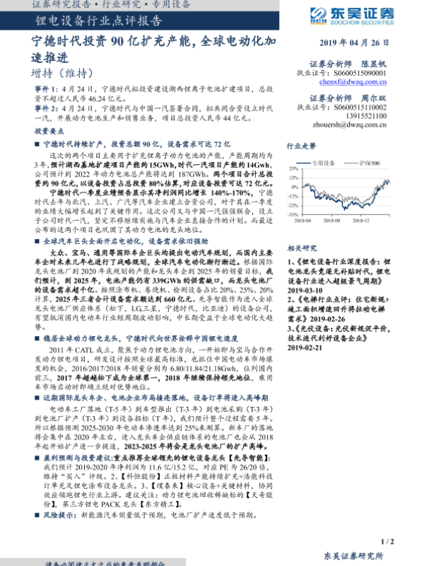 【东吴证券】【20190426】锂电设备行业点评报告:宁德时代投资90亿扩充产能,全球电动化加速推进-2页