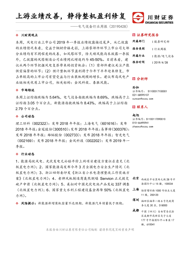 【川财证券】【20190428】电气设备行业周报:上游业绩改善,静待整机盈利修复-10页