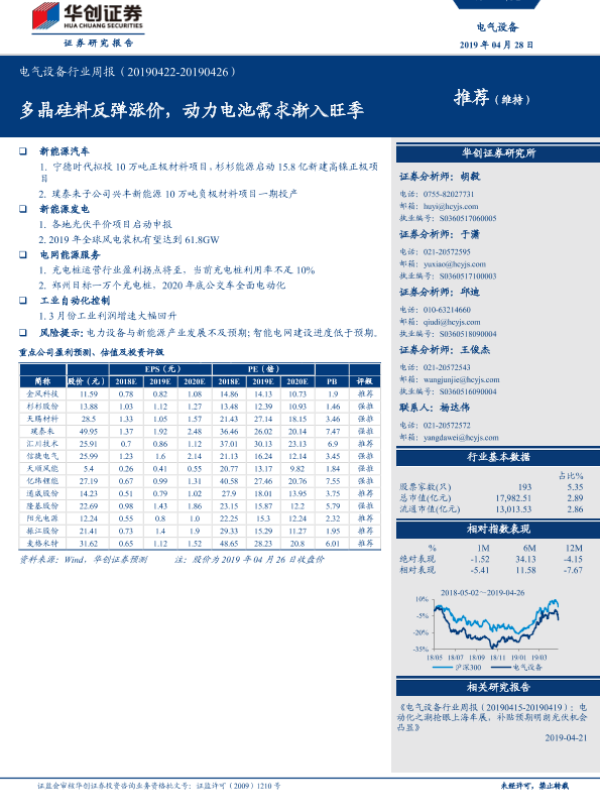 【华创证券】【20190428】电气设备行业周报:多晶硅料反弹涨价,动力电池需求渐入旺季-24页