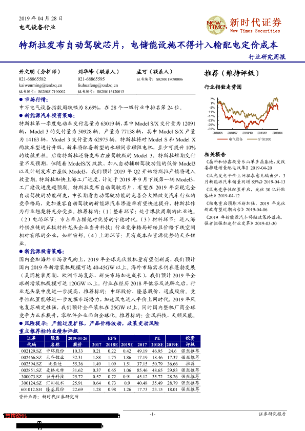 【新时代证券】【20190428】电气设备行业研究周报:特斯拉发布自动驾驶芯片,电储能设施不得计入输配电定价成本-18页